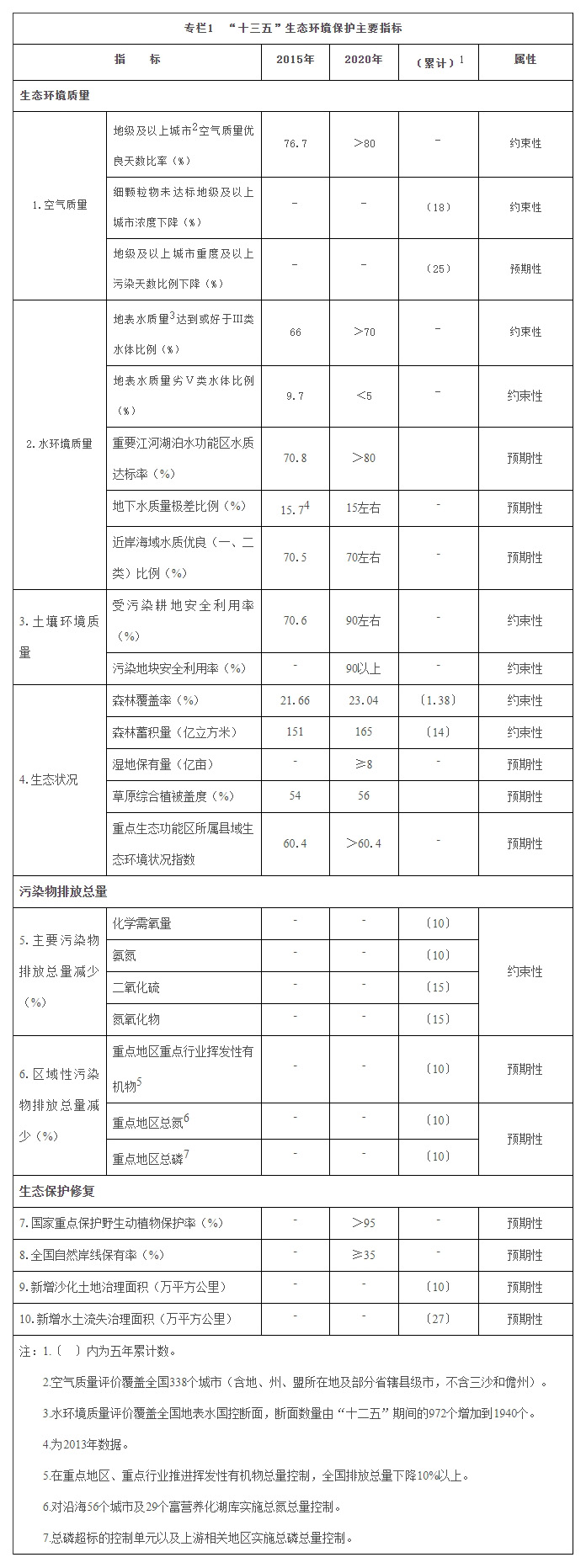 生態(tài)環(huán)境質(zhì)量有所改善。2015年,全國(guó)338個(gè)地級(jí)及以上城市細(xì)顆粒物(PM2.5)年均濃度為50微克/立方米,首批開展監(jiān)測(cè)的74個(gè)城市細(xì)顆粒物年均濃度比2013年下降23.6%,京津冀、長(zhǎng)三角、珠三角分別下降27.4%、20.9%、27.7%,酸雨區(qū)占國(guó)土面積比例由歷史高峰值的30%左右降至7.6%,大氣污染防治初見成效。全國(guó)1940個(gè)地表水國(guó)控?cái)嗝姊瘛箢惐壤岣咧?6%,劣Ⅴ類比例下降至9.7%,大江大河干流水質(zhì)明顯改善。全國(guó)森林覆蓋率提高至21.66%,森林蓄積量達(dá)到151.4億立方米,草原綜合植被蓋度54%。建成自然保護(hù)區(qū)2740個(gè),占陸地國(guó)土面積14.8%,超過90%的陸地自然生態(tài)系統(tǒng)類型、89%的國(guó)家重點(diǎn)保護(hù)野生動(dòng)植物種類以及大多數(shù)重要自然遺跡在自然保護(hù)區(qū)內(nèi)得到保護(hù),大熊貓、東北虎、朱鹮、藏羚羊、揚(yáng)子鱷等部分珍稀瀕危物種野外種群數(shù)量穩(wěn)中有升。荒漠化和沙化狀況連續(xù)三個(gè)監(jiān)測(cè)周期實(shí)現(xiàn)面積“雙縮減”。