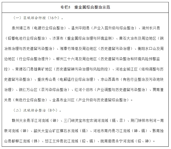 深化重點(diǎn)區(qū)域分類防控。重金屬污染防控重點(diǎn)區(qū)域制定實(shí)施重金屬污染綜合防治規(guī)劃,有效防控環(huán)境風(fēng)險(xiǎn)和改善區(qū)域環(huán)境質(zhì)量,分區(qū)指導(dǎo)、一區(qū)一策,實(shí)施差別化防控管理,加快湘江等流域、區(qū)域突出問題綜合整治,“十三五”期間,爭(zhēng)取20個(gè)左右地區(qū)退出重點(diǎn)區(qū)域。在江蘇靖江市、浙江平陽縣等16個(gè)重點(diǎn)區(qū)域和江西大余縣浮江河流域等8個(gè)流域開展重金屬污染綜合整治示范,探索建立區(qū)域和流域重金屬污染治理與風(fēng)險(xiǎn)防控的技術(shù)和管理體系。建立“錳三角”(錳礦開采和生產(chǎn)過程中存在嚴(yán)重環(huán)境污染問題的重慶市秀山縣、湖南省花垣縣、貴州省松桃縣三個(gè)縣)綜合防控協(xié)調(diào)機(jī)制,統(tǒng)一制定綜合整治規(guī)劃。優(yōu)化調(diào)整重點(diǎn)區(qū)域環(huán)境質(zhì)量監(jiān)測(cè)點(diǎn)位,2018年底前建成全國(guó)重金屬環(huán)境監(jiān)測(cè)體系。