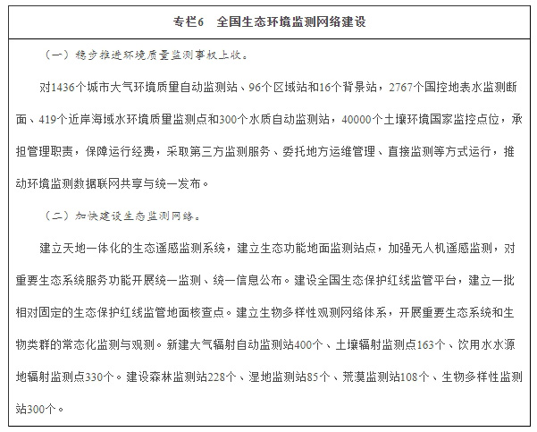 加強(qiáng)生態(tài)環(huán)境監(jiān)測(cè)網(wǎng)絡(luò)建設(shè)。統(tǒng)一規(guī)劃、優(yōu)化環(huán)境質(zhì)量監(jiān)測(cè)點(diǎn)位,建設(shè)涵蓋大氣、水、土壤、噪聲、輻射等要素,布局合理、功能完善的全國(guó)環(huán)境質(zhì)量監(jiān)測(cè)網(wǎng)絡(luò),實(shí)現(xiàn)生態(tài)環(huán)境監(jiān)測(cè)信息集成共享。大氣、地表水環(huán)境質(zhì)量監(jiān)測(cè)點(diǎn)位總體覆蓋80%左右的區(qū)縣,人口密集的區(qū)縣實(shí)現(xiàn)全覆蓋,土壤環(huán)境質(zhì)量監(jiān)測(cè)點(diǎn)位實(shí)現(xiàn)全覆蓋。提高大氣環(huán)境質(zhì)量預(yù)報(bào)和污染預(yù)警水平,強(qiáng)化污染源追蹤與解析,地級(jí)及以上城市開展大氣環(huán)境質(zhì)量預(yù)報(bào)。建設(shè)國(guó)家水質(zhì)監(jiān)測(cè)預(yù)警平臺(tái)。加強(qiáng)飲用水水源和土壤中持久性、生物富集性以及對(duì)人體健康危害大的污染物監(jiān)測(cè)。加強(qiáng)重點(diǎn)流域城鎮(zhèn)集中式飲用水水源水質(zhì)、水體放射性監(jiān)測(cè)和預(yù)警。建立天地一體化的生態(tài)遙感監(jiān)測(cè)系統(tǒng),實(shí)現(xiàn)環(huán)境衛(wèi)星組網(wǎng)運(yùn)行,加強(qiáng)無人機(jī)遙感監(jiān)測(cè)和地面生態(tài)監(jiān)測(cè)。構(gòu)建生物多樣性觀測(cè)網(wǎng)絡(luò)。