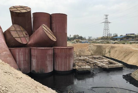 控制源頭。在事件現(xiàn)場設(shè)置了三道圍堰,確保儲(chǔ)罐區(qū)泄漏的硫酸控制在施工坑體內(nèi)。同時(shí),確保2個(gè)大廢酸儲(chǔ)罐的絕對安全。事件發(fā)生時(shí),2個(gè)大儲(chǔ)罐已有輕微傾斜。為防止小儲(chǔ)罐泄漏的硫酸浸泡腐蝕大儲(chǔ)罐,采取填土方式穩(wěn)固大儲(chǔ)罐,并實(shí)時(shí)監(jiān)測大儲(chǔ)罐是否下沉、傾斜、泄漏。